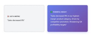 - An insight explains why it matters: “Sales decreased 8 percent in our highest-margin product category, driven by a competitor’s aggressive promotion, threatening our Q4 profitability targets”